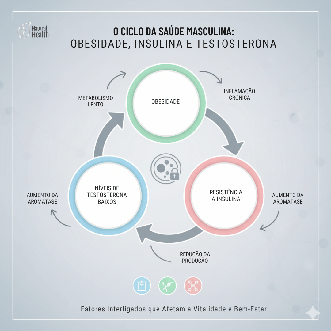 - Resistência insulínica e desequilíbrios hormonais: o metabolismo insulinorresistente altera a produção de hormônios do eixo HPT (hipotálamo-hipófise-testículo), reduzindo o estímulo para a produção de testosterona.