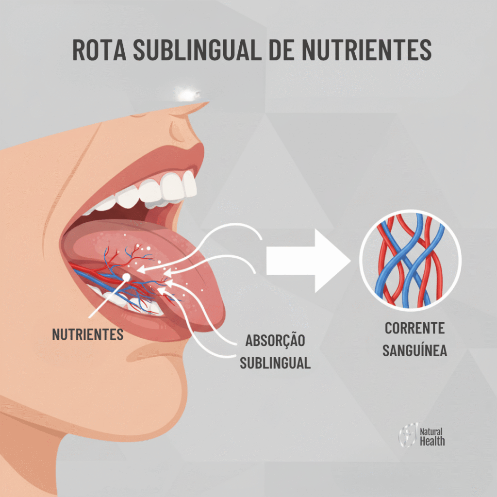Os nutrientes sublinguais aproveitam a fina rede de capilares sob a língua. Quando aplicados nessa região, são absorvidos quase instantaneamente. O mecanismo é conhecido na medicina há décadas — usado, por exemplo, em medicamentos cardiovasculares de ação rápida, como a nitroglicerina.
